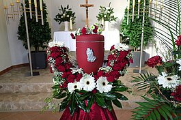 Wir organisieren die Gestaltung der Trauerhalle mit Bildern und Blumen nach Ihren Wünschen.
